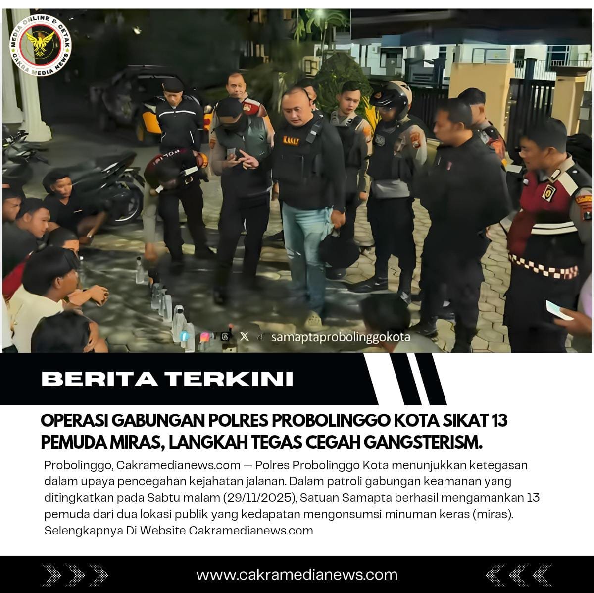 ‎Probolinggo,cakramedianews.com- Polres Probolinggo Kota menunjukkan ketegasan dalam upaya pencegahan kejahatan jalanan. Dalam patroli gabungan keamanan yang ditingkatkan pada Sabtu malam (29/11/2025), Satuan Samapta berhasil mengamankan 13 pemuda dari dua lokasi publik yang kedapatan mengonsumsi minuman keras (miras).