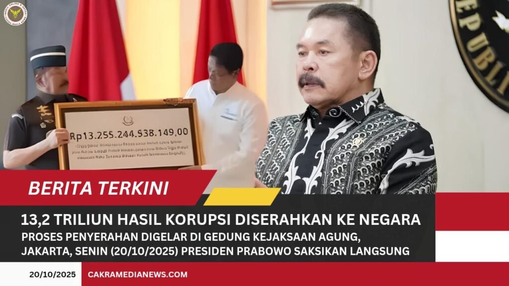 Proses penyerahan digelar di Gedung Kejaksaan Agung, Jakarta, Senin (20/10/2025), dan disaksikan langsung oleh Presiden RI Prabowo Subianto bersama jajaran pejabat pemerintahan.