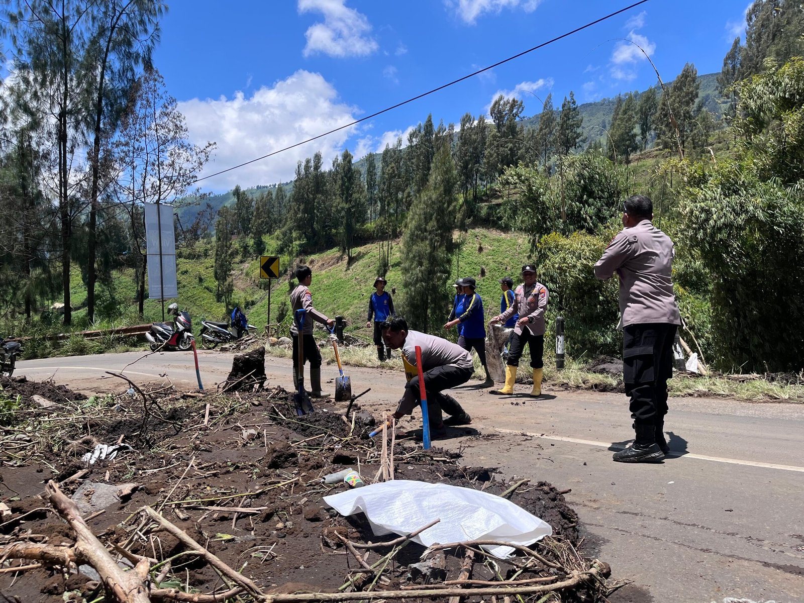Aksi cepat tanggap ditunjukkan personel Polsek Sukapura Polres Probolinggo dalam menangani bencana tanah longsor yang menutup jalur menuju wisata Gunung Bromo, Kabupaten Probolinggo, pada Rabu (1/10/2025).