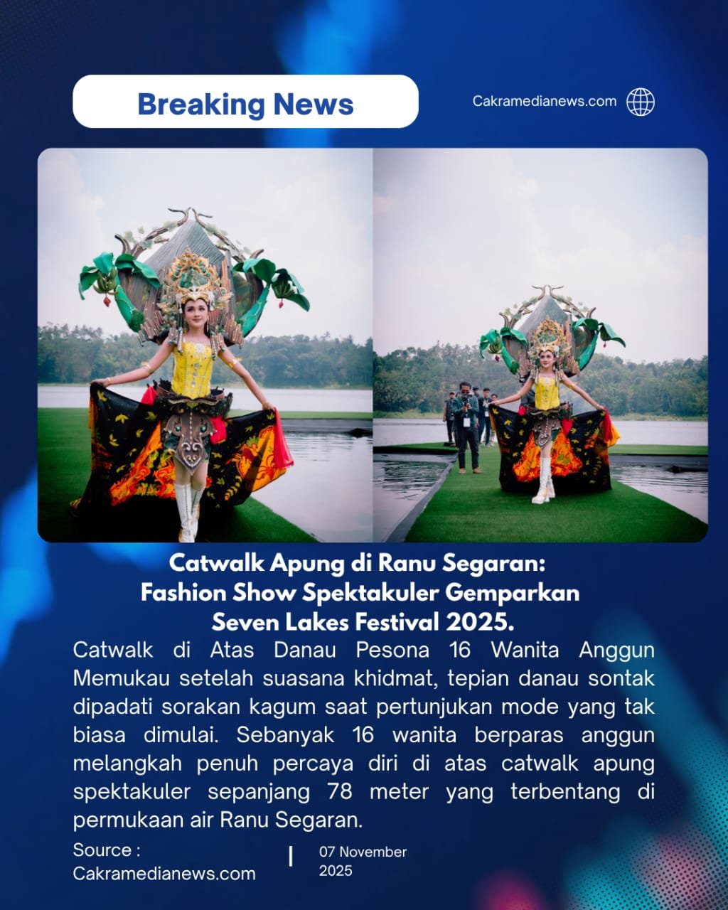 Probolinggo,cakramedianews.com-Seven Lakes Festival Probolinggo 2025 resmi bergulir pada Jumat, diawali dengan momen yang memadukan spiritualitas mendalam dan pagelaran modern yang memukau. Danau Ranu Segaran di Kecamatan Tiris menjadi saksi bisu prosesi Larung Sesaji yang khidmat di pagi hari, disusul penampilan fashion show spektakuler di atas air yang memantik decak kagum ribuan pengunjung. Jum’at (7/11/2025).