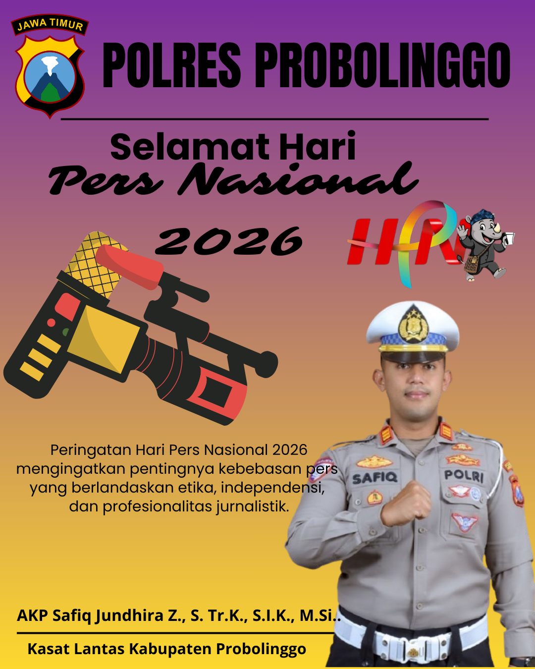 Kasat Lantas Kabupaten Probolinggo, AKP Safiq Jundhira Z., S. Tr.K., S.I.K., M.Si.. Mengucapkan Peringatan Hari Pers Nasional 2026 mengingatkan pentingnya kebebasan pers yang berlandaskan etika, independensi, dan profesionalitas jurnalistik.(Mis)