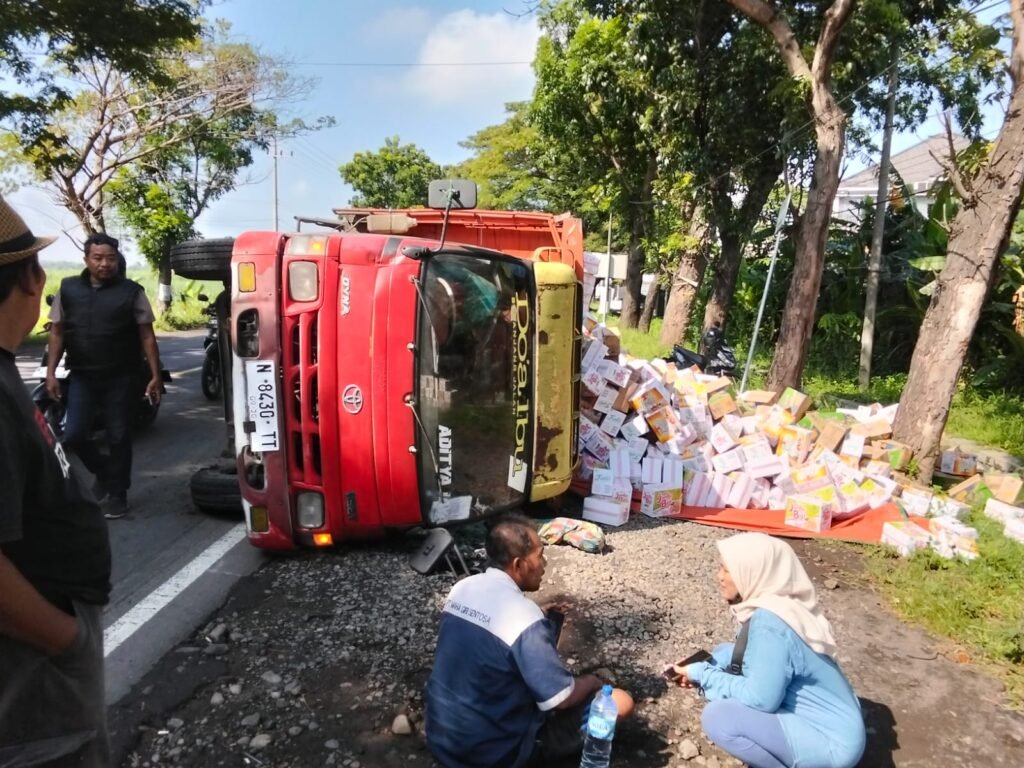 Probolinggo,cakramedianews.com- Sebuah kecelakaan tunggal terjadi di jalan Pantura tepatnya di Desa Karanggeger, Kecamatan Pajarakan, Kabupaten Probolinggo, pada Selasa 3/2/2026. Melibatkan Truk dengan nomor N 8430 TT yang mengangkut minuman dari Pasuruan ke Banyuwangi mengalami kecelakaan karena As patah dan roda belakang sebelah kiri terlepas.