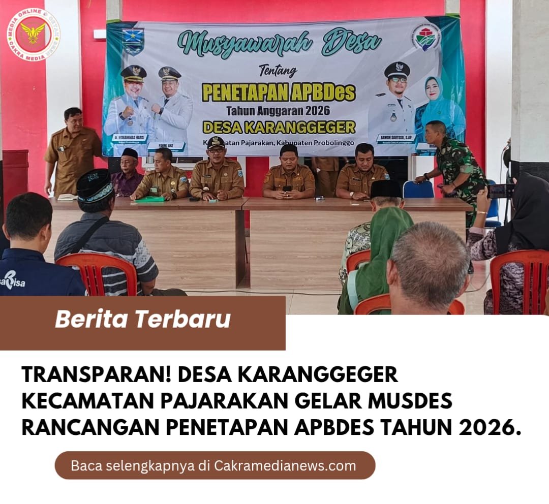 ‎Pajarakan,cakramedianews.com – Pemerintah Desa Karanggeger, Kecamatan Pajarakan, sukses menggelar Musyawarah Desa (Musdes) penetapan Anggaran Pendapatan dan Belanja Desa (APBDes) Tahun Anggaran 2026. Kegiatan strategis yang dilaksanakan di Balai Desa Karanggeger pada Senin (08/12/2025) ini dihadiri lengkap oleh Camat Pajarakan, Kabid PMD, unsur Polsek, Koramil, BPD, dan seluruh elemen masyarakat.