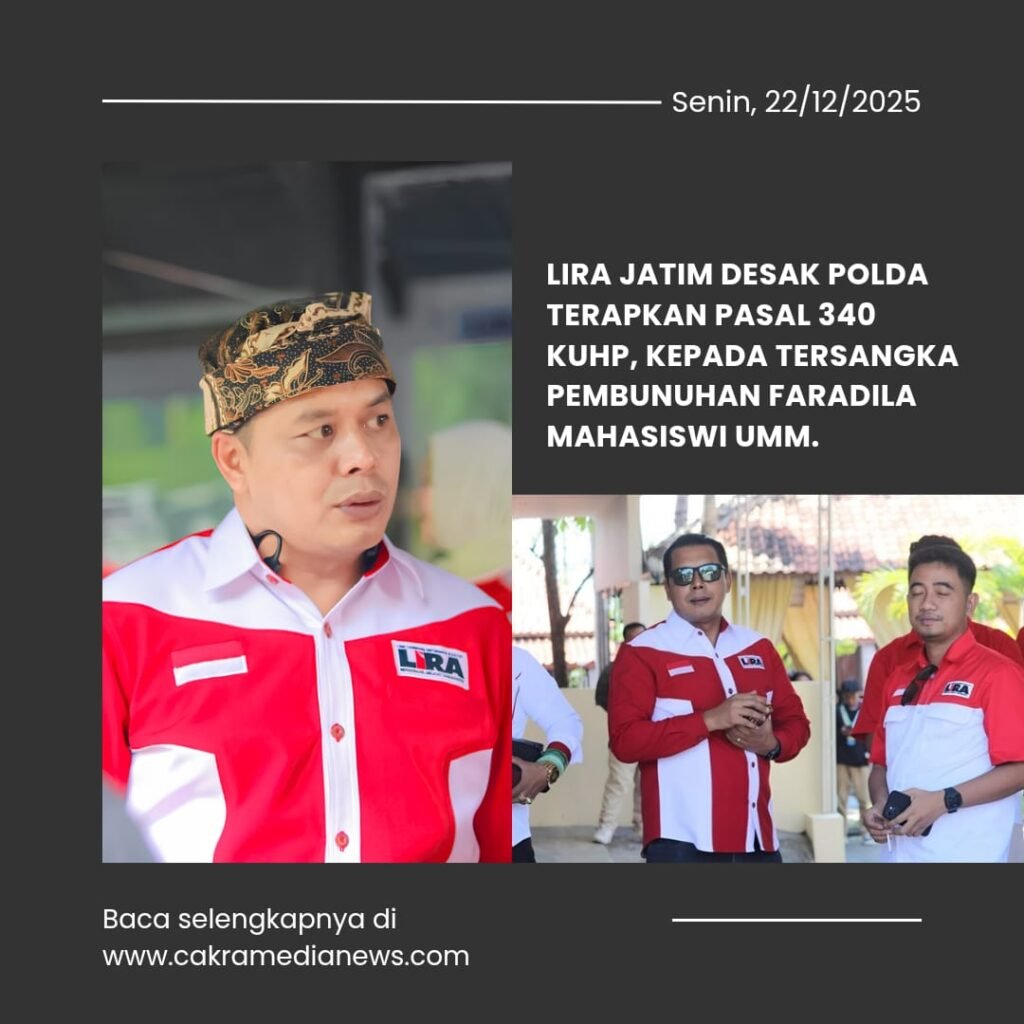 Probolinggo,cakramedianews.com- Gelombang tuntutan keadilan bagi Faradila Amalia Najwa (21), mahasiswi UMM asal Tiris, Probolinggo yang tewas mengenaskan, semakin menguat. Gubernur LSM LIRA Jawa Timur, Samsudin, secara tegas mendesak penyidik Polda Jawa Timur untuk menjerat tersangka utama, Bripka AS, dengan Pasal 340 KUHP tentang Pembunuhan Berencana.