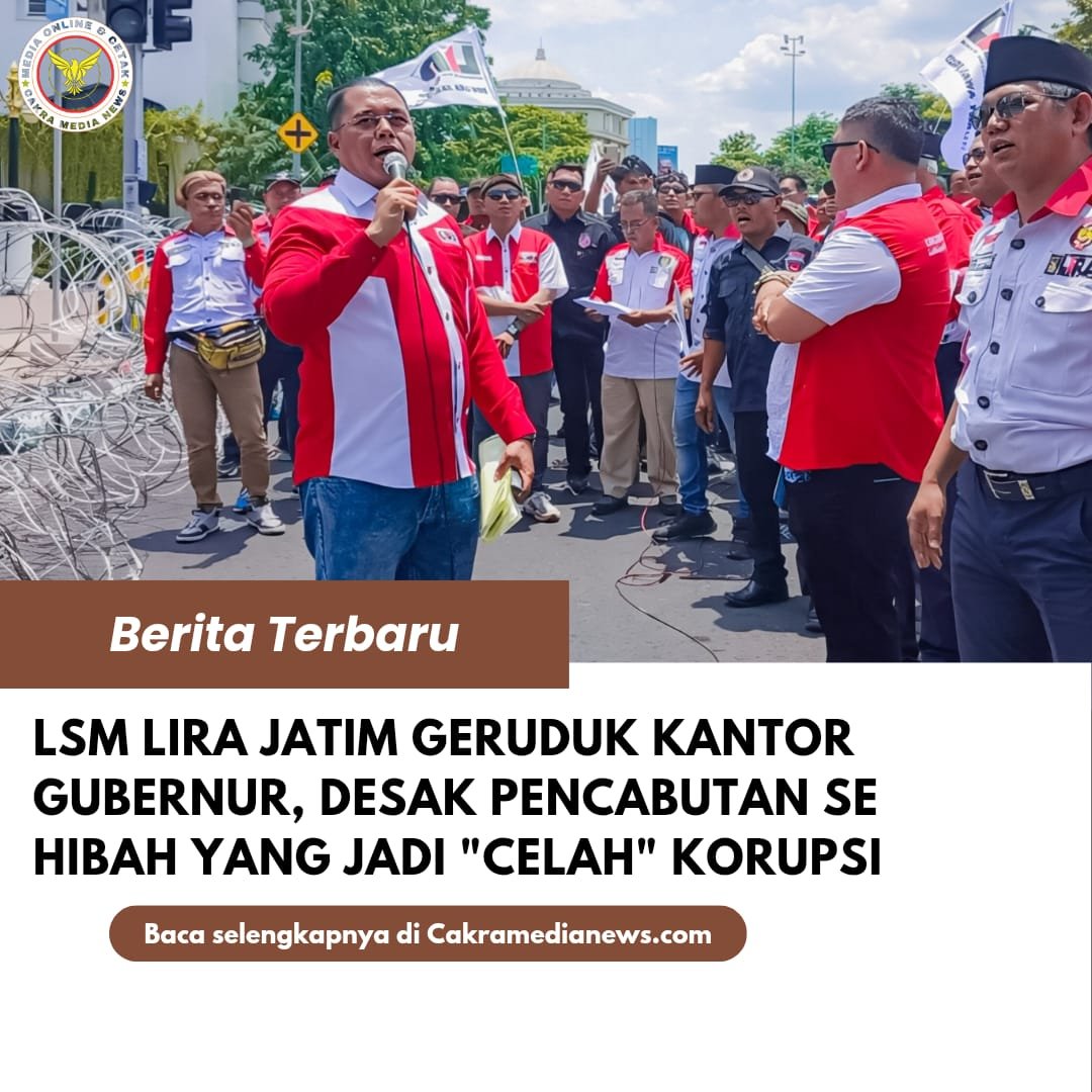Surabaya,cakramedianews.com– Puluhan massa dari Dewan Pimpinan Wilayah (DPW) LSM LIRA Jawa Timur menggelar aksi unjuk rasa di depan Kantor Gubernur Jawa Timur, Kamis (12/2/2026). Mereka menuntut ketegasan pemerintah untuk mencabut Surat Edaran (SE) Gubernur Tahun 2019 yang dinilai menjadi pintu masuk praktik korupsi dana hibah di Jawa Timur.