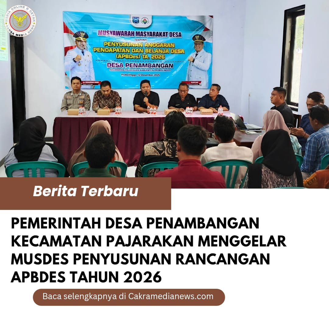 Probolinggo,cakramedianews.com- Pemerintah Desa Penambangan Kecamatan Pajarakan, Kabupaten Probolinggo, menunjukkan keseriusan dalam perencanaan pembangunan dengan menggelar Musyawarah Desa (Musdes) Penyusunan Rancangan Anggaran Pendapatan dan Belanja Desa (APBDes) Tahun Anggaran 2026. Kegiatan strategis yang digelar di Balai Desa Penambangan pada Selasa (9/12/25) ini dihadiri lengkap oleh seluruh elemen penting desa.