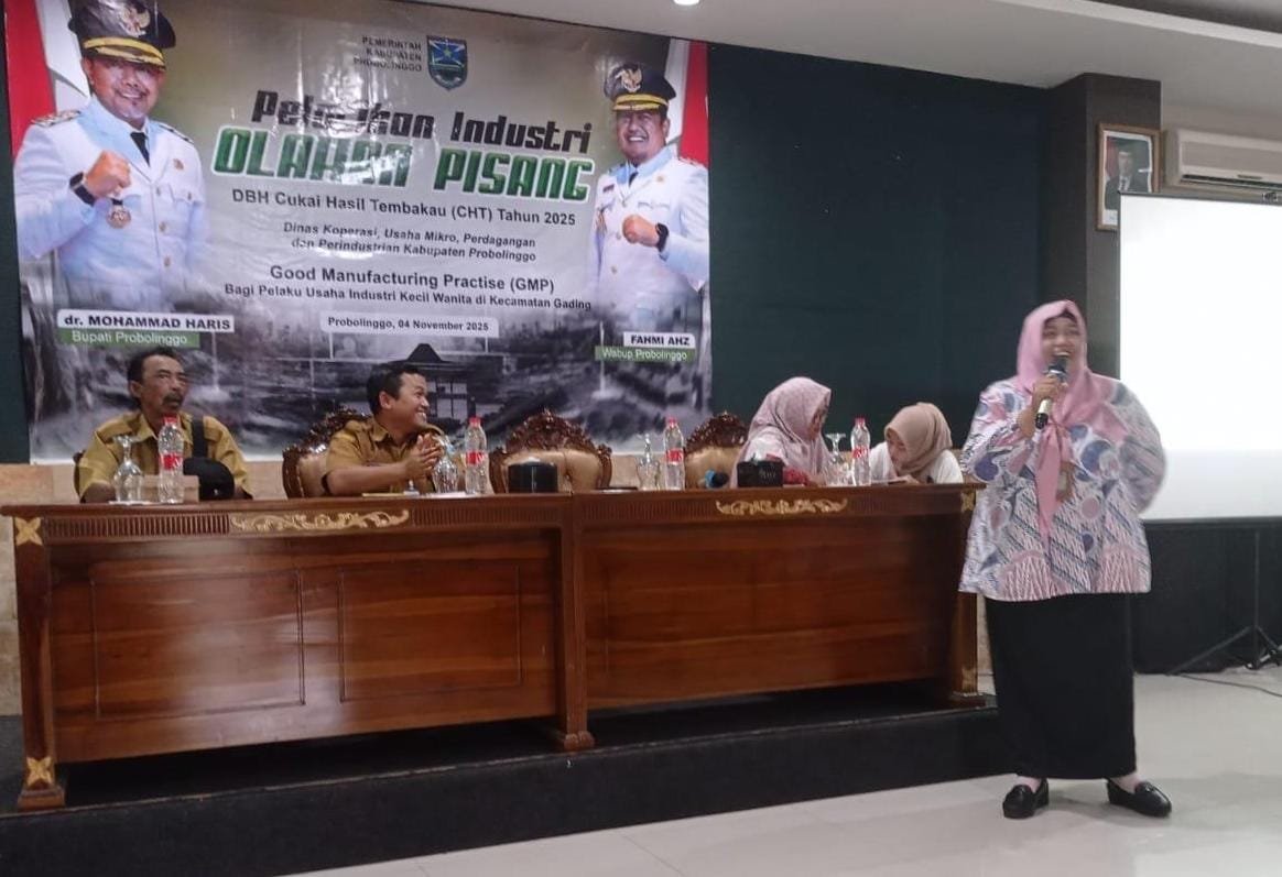 Probolinggo,cakramedianews.com- Pemerintah Kabupaten (Pemkab) Probolinggo melalui Dinas Koperasi, Usaha Mikro, Perdagangan dan Perindustrian (DKUPP) terus memperkuat kapasitas pelaku usaha mikro, khususnya perempuan. Hal ini diwujudkan melalui pelatihan industri olahan pisang berstandar Good Manufacturing Practice (GMP) yang digelar di Kampoeng Kita Hotel & Resto Desa Condong Kecamatan Gading, Selasa (4/11/2025).