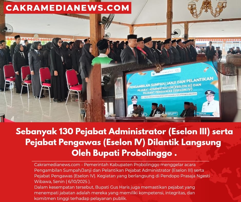 Berdasarkan Keputusan Bupati Probolinggo Nomor 426.202/2025 tanggal 3 Oktober 2025, sebanyak 69 orang pejabat Administrator (Eselon III) dan 60 orang pejabat Pengawas (Eselon IV) resmi dilantik. Dalam keputusan tersebut juga ditegaskan bahwa setiap pejabat berhak atas tunjangan jabatan sesuai ketentuan yang berlaku, dan keputusan mulai berlaku sejak tanggal pelantikan.