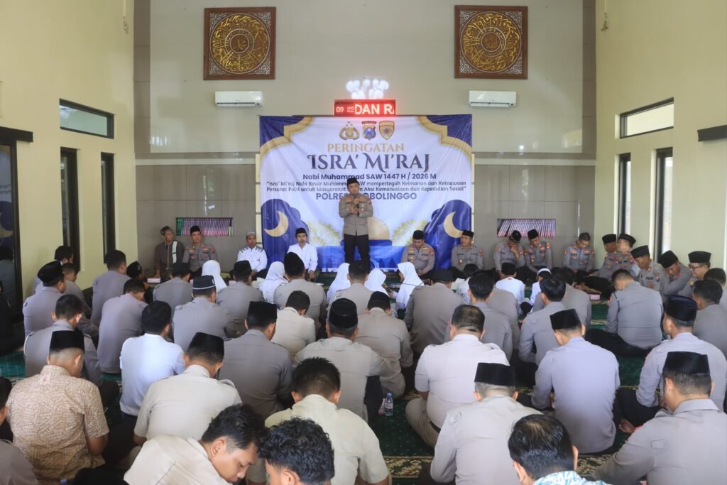 Polres Probolinggo Polda Jawa Timur menggelar Peringatan Isra Mi’raj Nabi Muhammad SAW 1447 Hijriah/2026 Masehi yang berlangsung khidmat di Masjid Amanullah Polres Probolinggo, Selasa (20/1/2026).