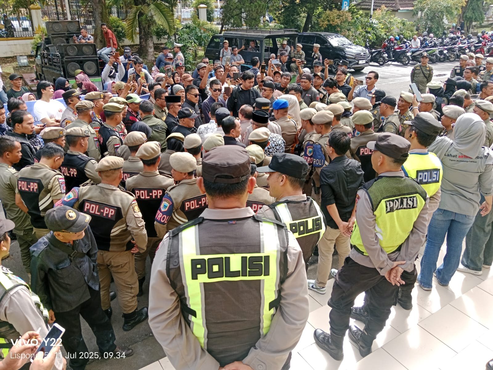 Lahat,cakramedianews.com-Melaksanakan Pengawalan dan pengamanan aksi unjuk rasa yang digelar oleh Forum Masyarakat Peduli Lahat pada Jumat, 11 Juli 2025. Aksi tersebut berlangsung di depan Kantor DPRD Kabupaten (Pemkab) Lahat dan berjalan secara tertib dan damai di bawah pengawasan ketat aparat kepolisian.