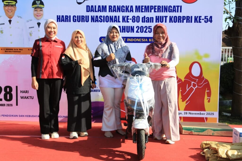 “Alhamdulillah senang sekali dan tidak menyangka dapat undian sepeda listrik dari jalan santai hari ini, motornya bisa buat kerja saya ngajar di TK Barunawati 1 Jrebeng Wetan. Semoga peringatan hari guru tahun ini sesuai temanya, ‘Guru Hebat, Indonesia Kuat’,” harapnya.