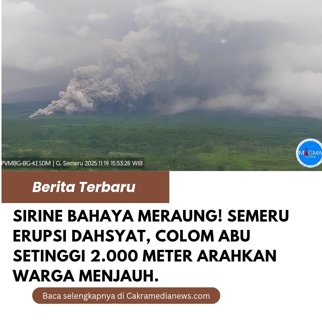 Lumajang,cakramedianews.com– Gunung Semeru di Lumajang kembali menunjukkan aktivitas vulkanik signifikan dengan erupsi dahsyat pada Rabu sore (19/11/2025), tepat pukul 16.00 WIB. Pusat Vulkanologi dan Mitigasi Bencana Geologi (PVMBG) melaporkan, tinggi kolom letusan teramati mencapai 2.000 meter di atas puncak, dengan semburan abu tebal berwarna kelabu yang bergerak dominan ke arah utara dan barat laut.
